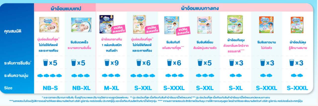 แพมเพิสมามี่โปะโกะ MamyPoko เข้ามาทำตลาดในประเทศไทยอย่างยาวนาน เป็นที่มั่นใจในคุณภาพ พัฒนารุ่นห่อสีส้ม Lovely All Day Dry ในราคาเพียงแผ่นละ 4 บาท เท่านั้น จึงมีรุ่นผ้าอ้อม MamyPoko ราคาถูกสำหรับใส่ในตอนกลางวัน และรุ่นอื่นๆ เมื่อซื้อยกลัง ก็ได้ราคาลังละ 1,000 ต้นๆ เท่านั้น