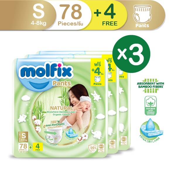 - Molfix Natural Pants S น้ำหนักน้อยกว่า 4-8 กิโลกรัม ซื้อยกลังตกแผ่นละ 4.52 บาท (คลิกสั่งซื้อที่นี่ Shopee)