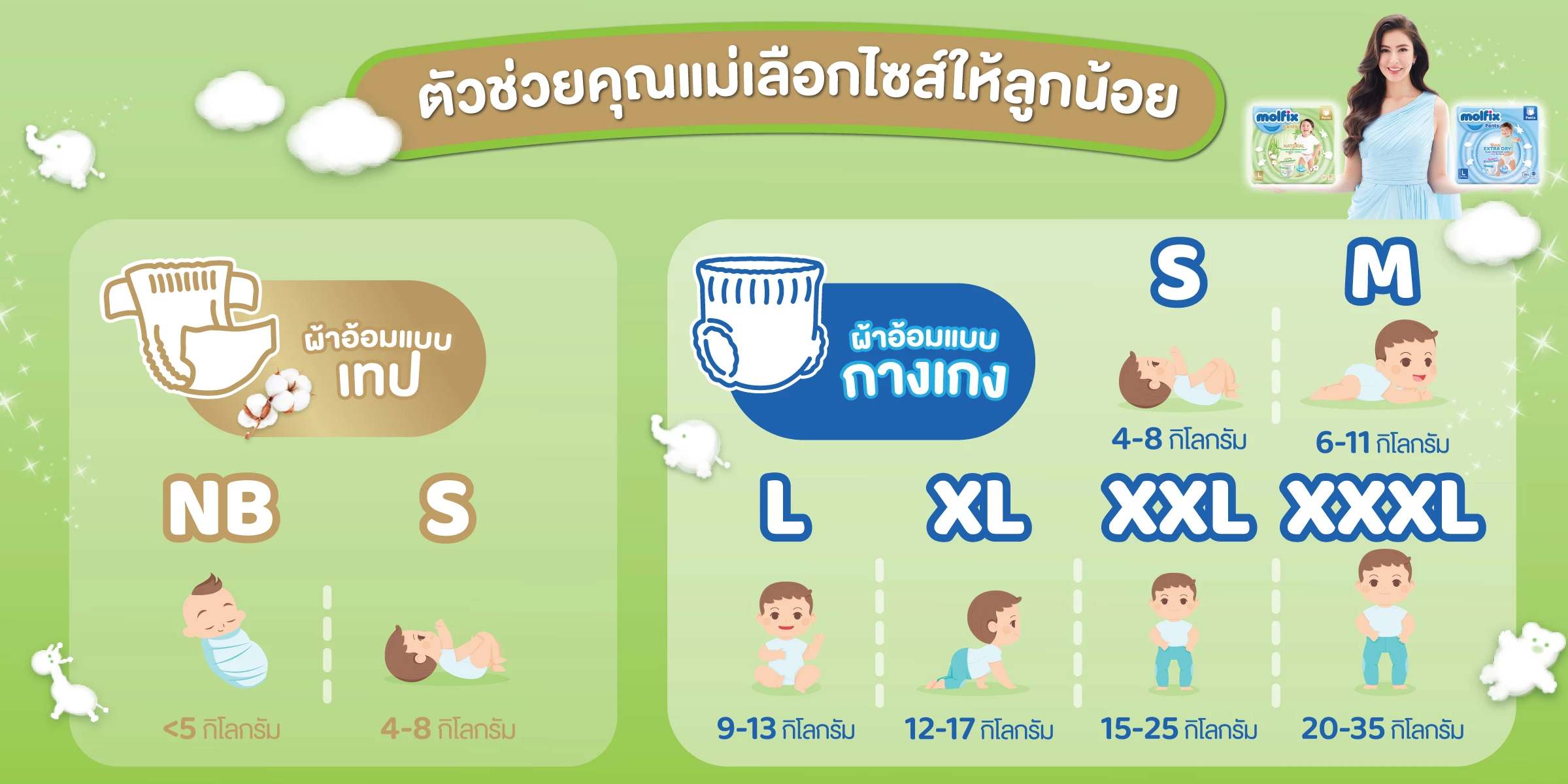 - Molfix Natural Pants XXXL น้ำหนักน้อยกว่า 20-35 กิโลกรัม ซื้อยกลังตกแผ่นละ 13.26 บาท (คลิกสั่งซื้อที่นี่ SHOPEE)