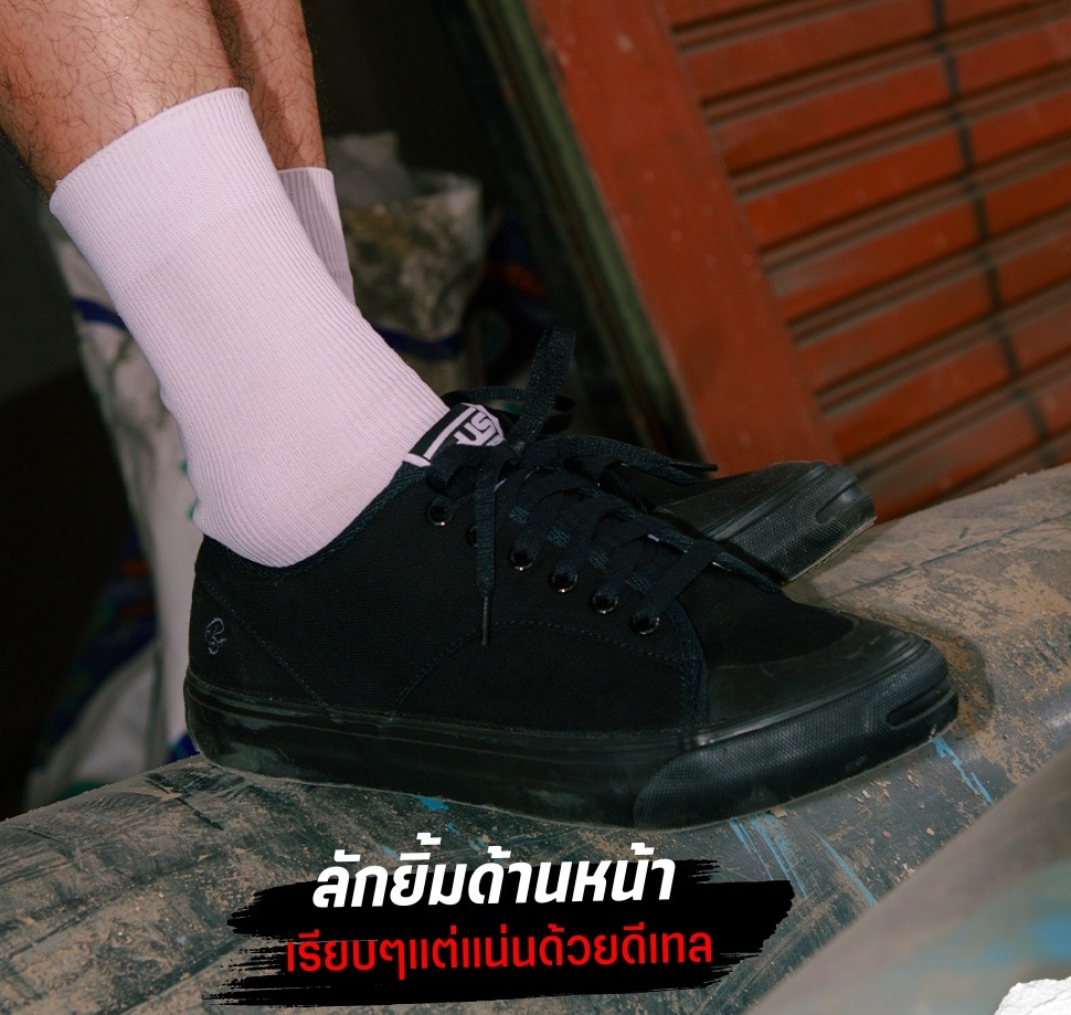 - สีดำทรงสปอร์จ มีพื้นเป็นยางสีน้ำตาลตัดกับสีผ้าใบ และขอบข้อเท้าต่ำ ทำให้เดินสะดวก