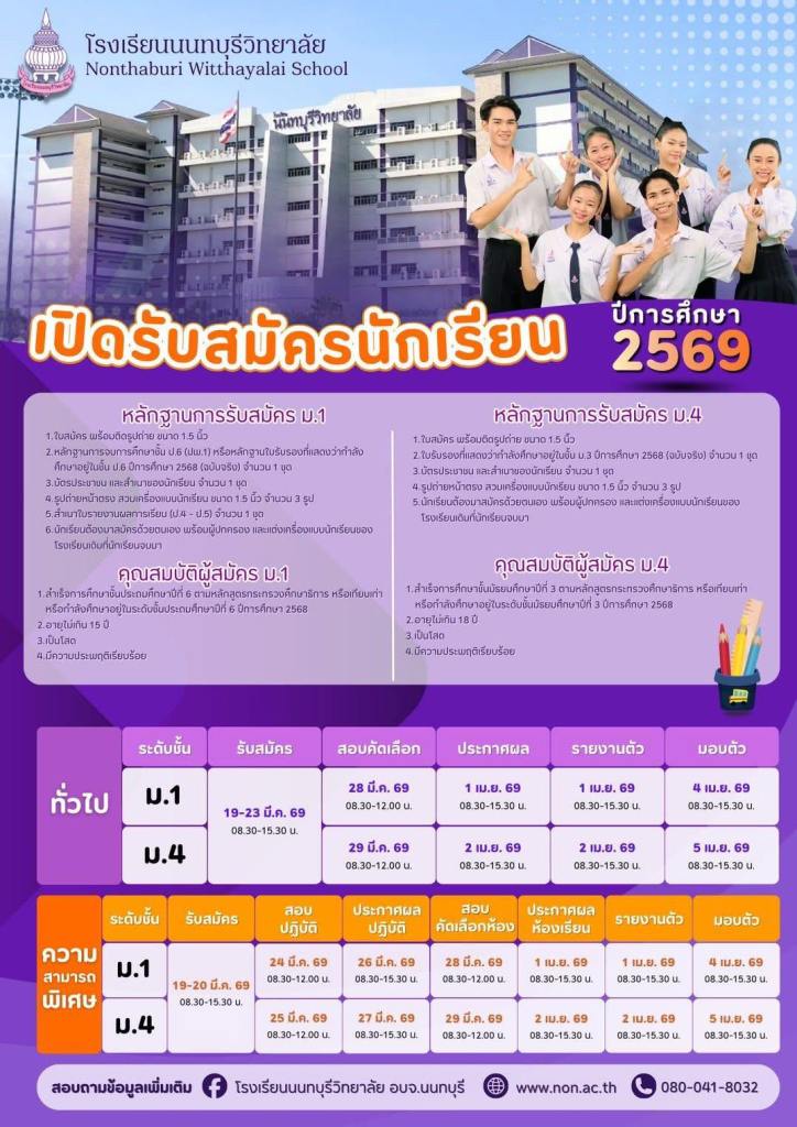 ผู้ปกครองและนักเรียนที่ต้องการสมัครเข้าศึกษาต่อ ณ โรงเรียนนนทบุรีวิทยาลัย ในระดับชั้นมัธยมศึกษาปีที่ 1 และ 4 ประจำปีการศึกษา 2569 โปรดตรวจสอบรายละเอียดขั้นตอนและกำหนดการรับสมัครอย่างละเอียด ดังนี้