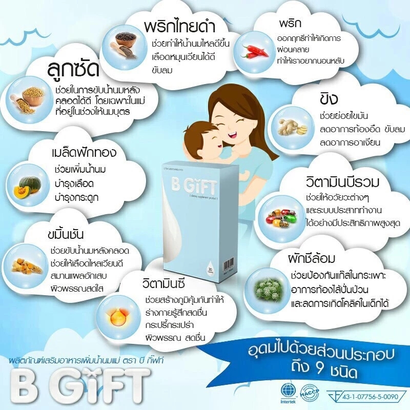 | B Gift | แคปซูล | มีเลซิติน ป้องกันท่อน้ำนมอุดตัน | 700 – 1,200 บาท |